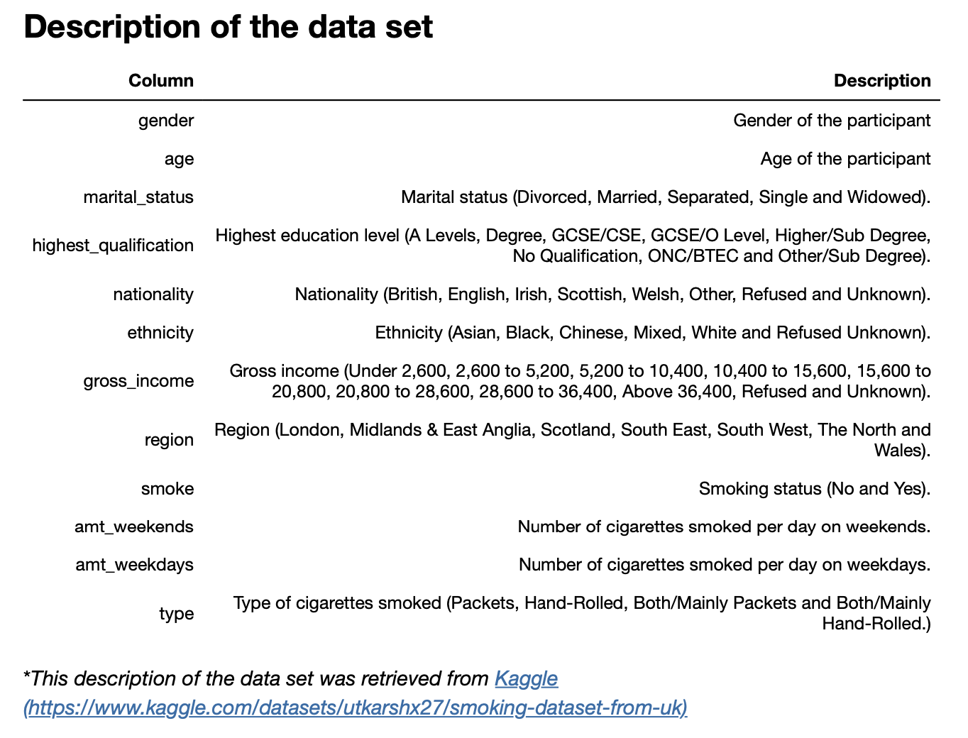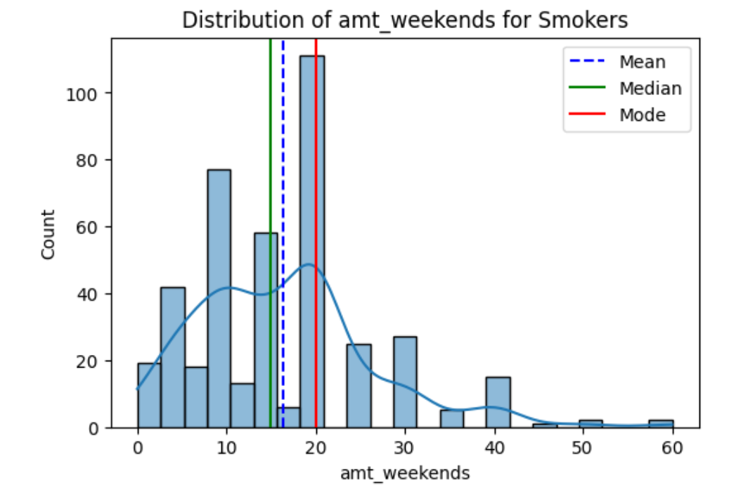 - Derived meaningful statistical insights about smoking behavior using measures of central tendency and dispersion.